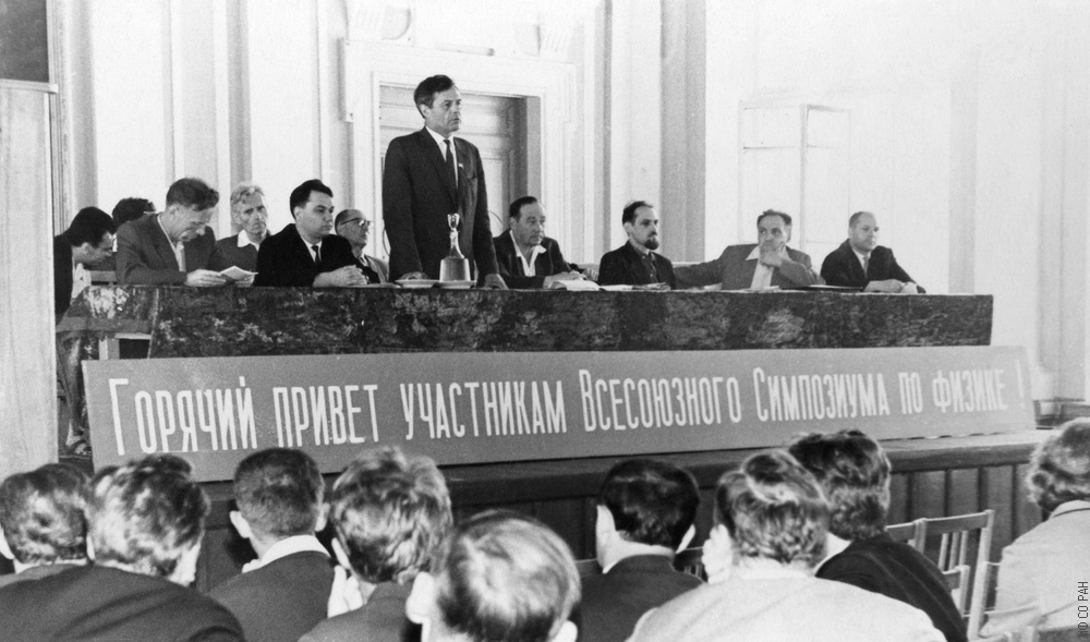 На снимке президиум Всесоюзного симпозиума по физике тонких ферромагнитных пленок в Иркутске в июле 1964 года. Второй слева В.А. Буравихин, ректор Иркутского государственного педагогического института, четвертый слева - Л.В. Киренский, директор Института физики Сибирского отделения Академии наук СССР.